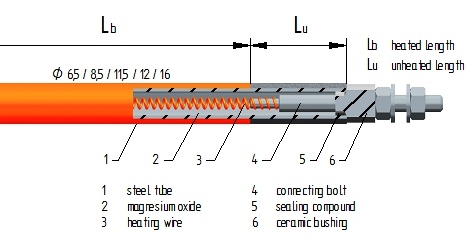 Tubular heaters consist of a steel tube (Ø 8.5 / 11.5 / 12 / 16 mm) and a coiled resistance wire which is aligned centrally in the tube and embedded in highly compacted magnesium oxide (MgO). This provides a durable and stable positioning of the heating element. Welded-on bolts are used as electrical connection and customizable unheated zone.