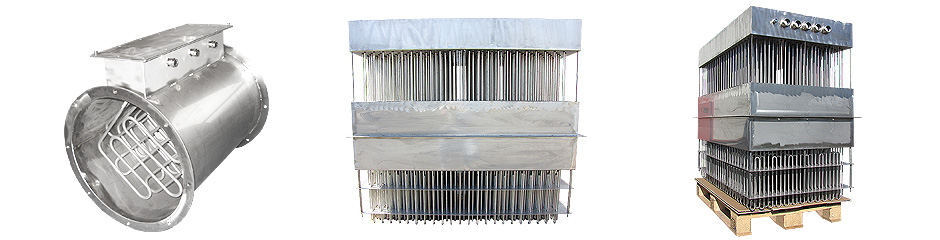 Bei der Konstruktion von zylindrischen Kanal-Lufterhitzern verwenden wir asymmetrisch gebogene Heizelemente oder bieten optional Übergangsstücke auf runde Luftkanäle an.